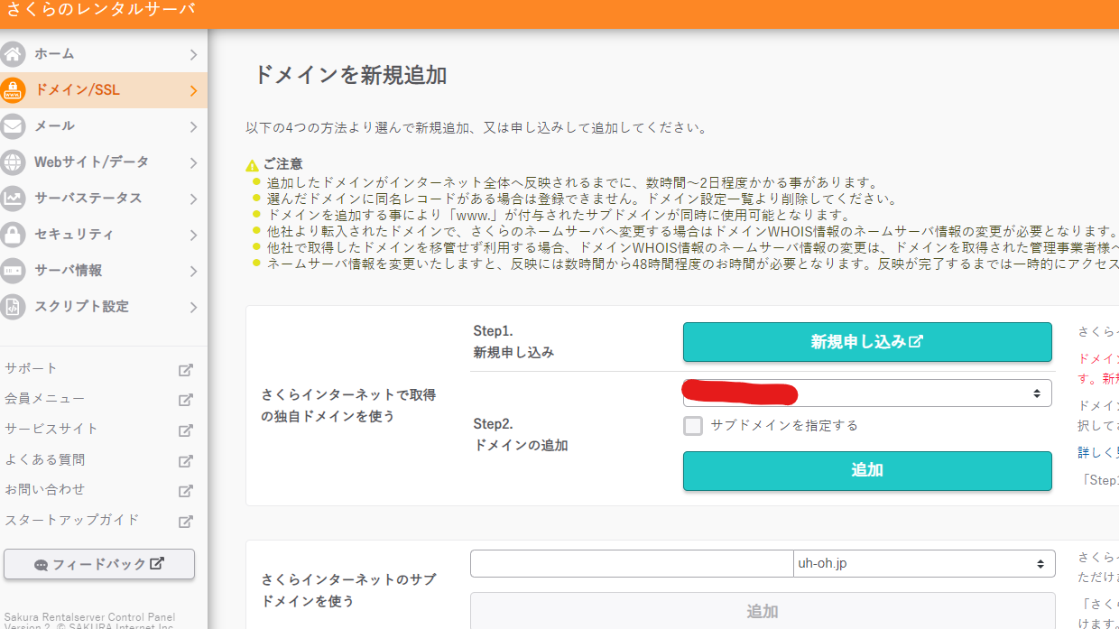 その間旧サイトが表示されたり、さくらの初期表示が表示されたりとかなり不安定だったのですが、約24時間後にやっと設定できるようになりました。何度も言いますが、皆さんは余裕をもって行いましょう。